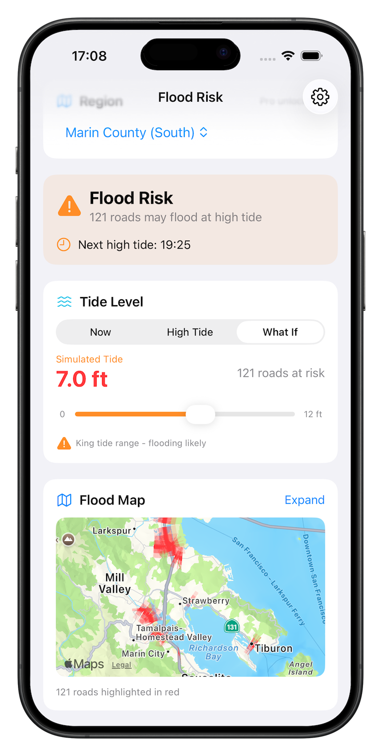 FloodRoute shows which roads may flood during high tides — before you drive into trouble. Using NOAA tide data and road elevation mapping, we highlight flood-prone streets so you can plan safer routes in coastal communities.